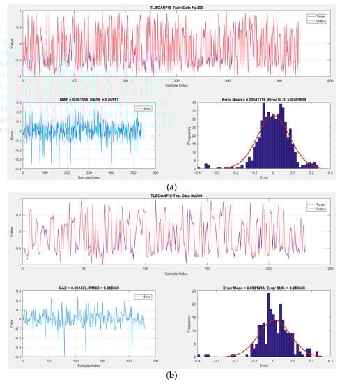 Error value and Frequency in TLBO–ANFIS-300 best fit structure. (a) Training dataset; (b) Testing dataset.