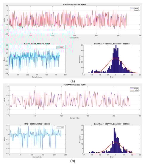 Error value and Frequency in TLBO–ANFIS-400 best fit structure. (a) Training dataset; (b) Testing dataset.