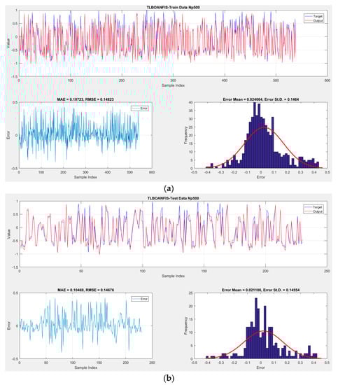 Error value and frequency in TLBO–ANFIS-500 best fit structure. (a) Training dataset; (b) Testing dataset.