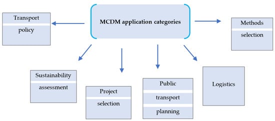 The interest in sustainable transport development has increased significantly over the last decade in both the scientific literature and political documents. Multi-criteria analysis for sustainable transport decision making is one of the most popular tools to account for all conflicting aspects of the problem. The main application areas in which different MCDM techniques have been applied in transport studies can be divided into six main categories (Figure 1).