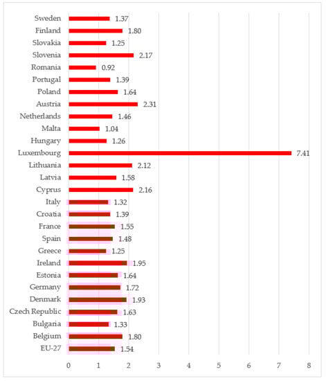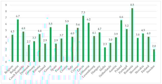 The road traffic deaths show the rate of persons killed in road accidents per the average number of people in the country. Surprisingly, the rate differs between some countries by more than four times. Specific examples are Sweden with the value of 2, and Romania, with the value of 8.5 (Figure 11). The lowest number of road fatalities was in 2020 (18,800). This significant decrease was influenced by the COVID-19 lockdowns []. In 2021, the number increased, but it was much lower than before the pandemic and reached 19,800. The EU target for 2030 is to decrease the number of road deaths by 11,400 or less []. Road safety depends on many factors, such as: the compliance of transport infrastructure with people’s needs; level of public awareness; regulatory system, etc.