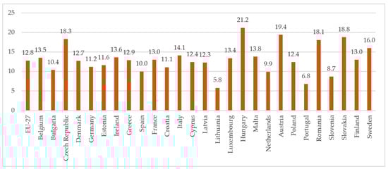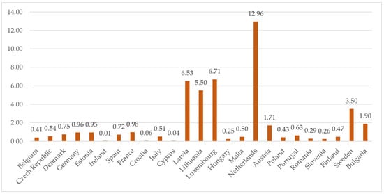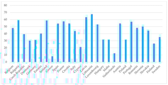 A well-developed public transport infrastructure that meets people’s needs can significantly reduce environmental pollution, ensure smooth transportation services, reduce city noise, contribute to safe traffic, and ensure the quality of people’s lives. The share of buses and trains in inland passenger transport differs significantly among EU countries (Figure 7). The lowest value was observed in Lithuania, where the share of buses and trains in inland passenger transport only reached 5.8%. Public transport services are not popular in the country. People have a preference for private cars not only for long travel, but also for travel in the city. Such preferences can be determined by many factors, but the most significant is convenience in terms of transport services. Thus, the low usage of public transport services is strongly determined by transport infrastructure planning issues (e.g., availability, travel time, comfort level, affordability, etc.).