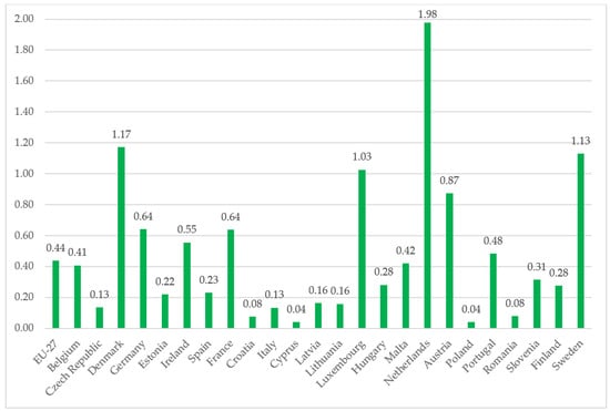 One of the measures to encourage the shift away from polluting diesel cars is through various support mechanisms for the purchase of electric cars. These mechanisms differ among countries. The development of electric cars is also significantly influenced by the development of solar energy at the household level, the level of public awareness, and according to economic factors. For these reasons, different penetration of the electric vehicles can be seen in the market (Figure 4). Although the EU-28 average was less than half a percent (0.44%) in some countries, the share of electric cars was more than twice as large. The biggest share of passenger electric cars was observed in The Netherlands (1.98%) in 2020. Twice or more the EU-28 average were Denmark (1.17%), Sweden (1.13%), Luxembourg (1.03) and Austria (0.87%). The countries where electric cars did not make up more than 0.1% can be individuated: Cyprus (0.04%), Poland (0.04%), Croatia (0.08%) and Romania (0.08%). Many countries were significantly below the EU-28 average, e.g., Italy (0.13%), Czech Republic (0.13%), Latvia (0.16%), Lithuania (0.16%), Estonia (0.22%) and Spain (0.23%).