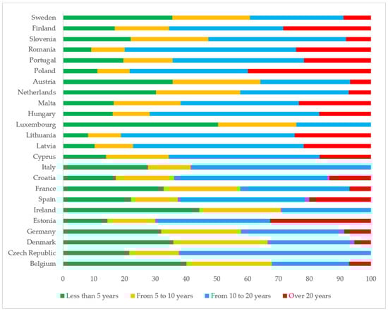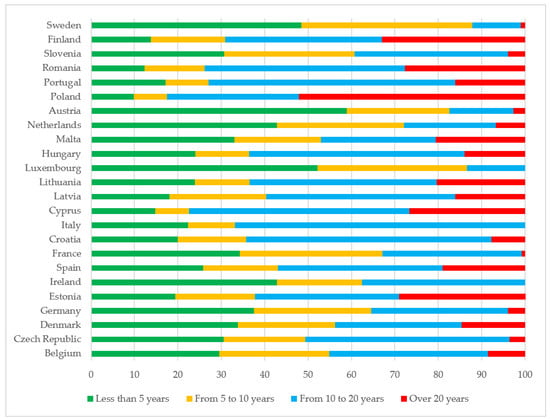 The environmental footprint from the transport sector can be decreased by the development of clean technologies and improvements in energy efficiency. The old polluting and energy inefficient cars should be replaced in order to implement climate change and energy policy goals. Figure 5 presents the share of passenger cars by age in EU countries in 2020. Figure 5 shows that the differences among countries are significant. Four countries can be identified as having no passenger cars older than twenty years: Luxembourg, Italy, Ireland and the Czech Republic. In contrast, a significant percent of all passenger car parks is older than twenty years in Poland (40%), Estonia (32.7%), Finland (28.45%), Lithuania (24.76%) and Romania (24.28%). Citizens in Luxembourg have the newest cars, where more than half of the cars are less than five years old, and the share of cars aged less than ten years accounts for 76% of all passenger cars in the country. Countries with the highest indicators include Belgium, Denmark and Austria, where the share of cars less than ten years old accounts for more than 60%.