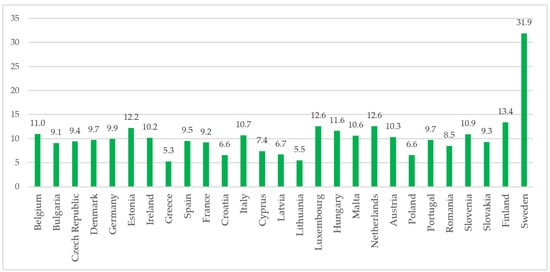 Sweden has impressive results regarding the share of RES in the transport sector (Figure 10). Almost one third (31.9%) of energy consumed in transport comes from RES. In most other countries, the share of RES ranges between 9 and 12%. However, in countries such as Greece, Lithuania, Croatia, Cyprus, Latvia and Poland, the portion of RES is low and accounts for only 5–7%. The urgent measures should be implemented in order to achieve the EU transport policy goals, especially in these countries which are falling behind.