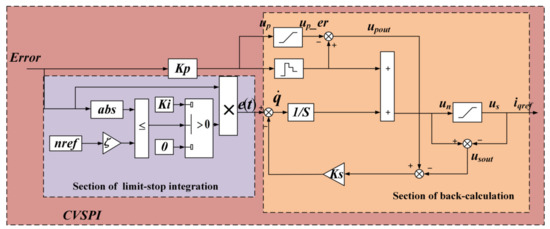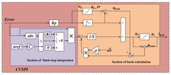- To minimize or do away with speed overshoot and speed-free control system regulation time, this paper builds on the foundation of the conventional AWPI by integrating the benefits of the encounter limit stop integral method and the inverse calculation method to design a CVSPI controller for use in IPMSM speed-free control systems.