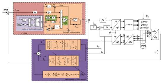 - Using the inverse calculation idea to introduce the MRAS estimated speed into the anti-saturation gain to accurately compensate for the system state, enabling the system to quickly exit the integral saturation zone, suppressing the integral saturation phenomenon, and improving the immunity of the system.