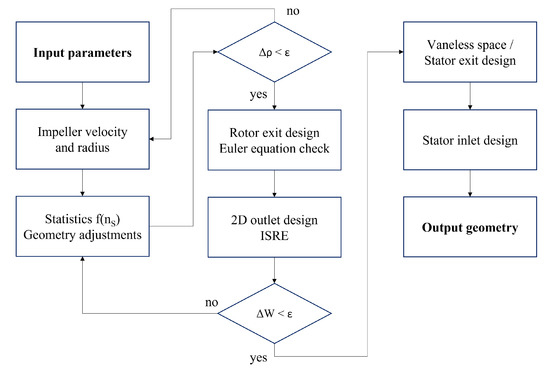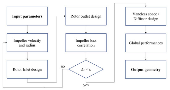Centrifugal compressor design was largely based on the data presented in Table 2, which were used as boundary conditions for the implemented procedure. Calculations were carried out by means of an in-house code developed in Matlab, the logic of which is visualized in Figure 1 and summarized in the following: