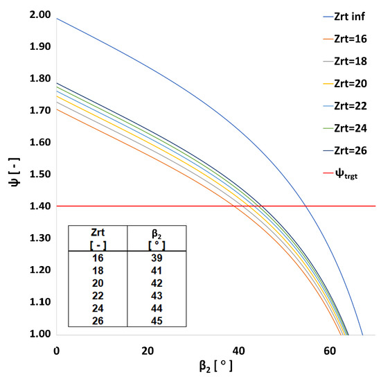 Backsweep angle was introduced in order to contain the action on the blade surface of Coriolis forces, responsible for the presence of the slip effect [13], which in the present work is accounted for by the classical model from Wiesner [32] for curved blades. The resulting blade bend allows for better machine efficiency at the expense of a slight radius increment. Indeed, the target PR is achieved by consecutively increasing the outlet radius up to the required value of the peripheral velocity [28]. Equations (1) and (2) describe the load factor as a function of the flow coefficient and the backsweep angle for an infinite and finite number of blades, respectively. By fixing the design values of other parameters into Equations (1) and (2), it is possible to determine the backsweep metal angle as a function of the number of blades. As can be seen from Figure 2, the required backsweep angle reduces as the number of blades grows due to better flow guidance. On the other hand, a high number of blades leads to increased aerodynamic losses in the channel. Hence, blade number is iterated based on impeller efficiency estimation.