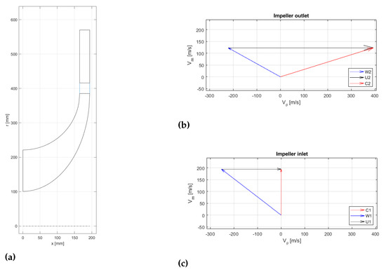 Compressor geometry: (a) meridional channel, impeller outlet (b) and inlet (c) velocity mean triangles. Subscripts: 1—impeller inlet; 2—impeller outlet.