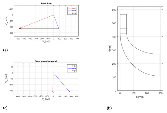 Analogously to the compressor, the turbine 1D design procedure was tested on a high-PR radial turbine from the literature [21], as documented in detail by Sauret [22]. The results are presented in Table 6 and show fairly good agreement with the reference literature. As such, the code was used to design the radial turbine suitable for a mini gas turbine in the present work; the results are summarized in Figure 6 and Table 7.