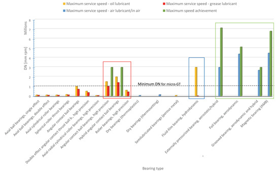Admissible peripheral speed DN for candidate supports; dotted line shows the minimum allowable DN for micro-GT units [45].