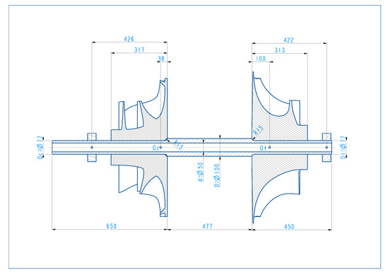 The pressure rise in the compressor and its sudden decrease in the turbine causes a force imbalance between the operating machines. The relevant axial loads in usual practice are partially compensated by sending pressurized air in the backdisk sealings [44] or by means of more sophisticated technical solutions [48]. For the present application, we propose that a small extraction of the mass flow exiting from the compressor is being used for sealing and force balance. Because the procedures described earlier for the 1D design of the turbine and compressor do not allow consistent simulation of the pressure variations, the axial forces exerted by both compressor and turbine are not known in the present design phase and they are ignored in the preliminary shaft design. After a detailed CFD (3D) simulation of the machine, the shaft structural analysis will be repeated, including these axial forces related to aerodynamic imbalance, which may perceptibly influence the stress distribution in the shaft. The mean operating temperatures of the uncooled compressor and turbine obtained averaging from rotor inlet to outlet are 200 and 700 C, respectively. The corresponding materials allowable for the application are expected to be titanium and nickel alloys, which allows for the assessment of the pertaining mass of the impellers at about 150 and 300 kg. Because the estimated weights ( kN and kN) exceed usual radial turbomachinery design applications [45], the proposed layout in Figure 8 introduces bearing supports for both machines. Albeit redundant, such a conservative solution aims to realize a balanced support for the heavy components.