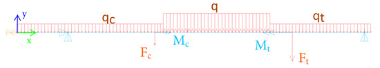 Differently, no shaft shoulders are required for hydrodynamic bearings, so the journal diameter is not reduced at the shaft ends where the supports are located. An eventual reduction in the journal diameter related to bearing stability issues emerging from dynamical analysis will be updated in future design phase. The shaft ends serve as journals of the hydrodynamic supports. The axial dimensions are chosen to fit the expected size of the remaining components of the mini-GT unit. The corresponding FE model is depicted in Figure 9, including loads acting on the shaft line. A 2D simulation is carried out by means of commercial FE software (Ansys 2019 R3) and simple beam elements (BEAM188). The model includes proper constraints in the support locations, i.e., zero displacement at the compressor combined (axial/radial) bearing location, zero vertical displacement at the turbine radial bearing position, and zero rotation at the compressor side end. Impeller weights are simulated by the lumped forces and , while shaft weight is considered by imposing suitable distributed loads q, , and , as shown by Figure 9. These are calculated by assuming a high-temperature steel or alloy material having a reference volumetric mass of about kg/m3. The proposed density is a reasonable overall value for nickel superalloys, in agreement with the work of Kutz [47], where values for such materials are reported in the range kg/m3. After this preliminary design, more detailed analyses will allow us to choose more specifically the proper material for this application. Finally, compressor and turbine torques of kNm and kNm. respectively, are determined from the corresponding 1D design and Equation (13).
