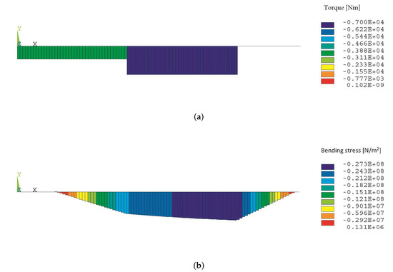 By assuming a working temperature of the shaft made of alloy steel equal to 450 C (average between compressor and turbine values), its material properties may be the following [49]: Young modulus GPa and Poisson ratio . Results of the FE structural analysis are presented in Figure 9, where the reference frame (x, y) is adopted to ease readability alongside the normalized coordinate , mm being the total shaft length. A maximum displacement of 0.77 mm is measured at roughly along the negative y axis. The shear force is negligible all over the shaft length and is then ignored. Therefore, the main stress source is torsion due to torque, which is presented in Figure 10a. Maximum shear stress is found to be constant, equal to MPa in proximity of the turbine housing shaft part (), which is the section with the minimum diameter .