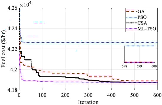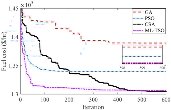 The same optimization problem was tackled by the GA, ML-TSO, and PSO algorithms to verify the simulation results achieved by the proposed CSA algorithm. The stopping criterion of the compared optimization methods’ simulation process was 600 iterations. The simulation results of the classical model were then compared and the results are shown in Table 5. The design variables are also included in the tables. The design variables are the power generated by conventional generators. Figure 11 provides a more graphical comparison between the convergence performance of the CSA, the GA, the ML-TSO, and the PSO in the IEEE 118-bus test system. In this figure, a focus on the last three iterations is also shown.