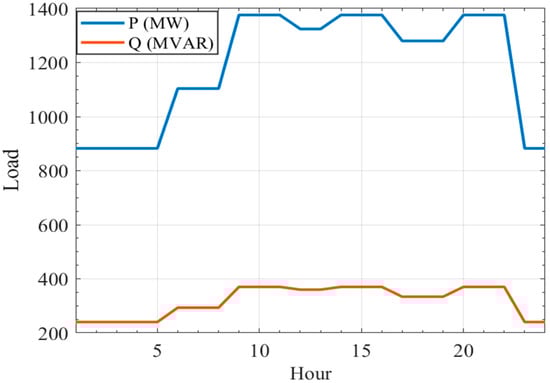 The loads were assumed to change hourly, as shown in Figure 12 []. The PV panels were connected to bus 4. Meanwhile, the WT was connected to bus 28. The one-line diagram of the standard IEEE 118-bus system is provided in Figure A2 in the Appendix A. The location of the PV panels is marked in red in the single-line diagram, while the sites of the WT are marked in green.