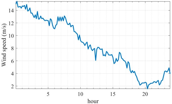 The nominal wind speed, allowable cut-in, and cut-off speeds of wind to operate the WT are set to 15, 2.7, and 25 m/s, respectively. The solar irradiance is set to 1000 W/m2 in standard conditions. The certain irradiance point (Rc) is set to 120 W/m2. This subsection aims to show the effect of integrating the RESs with the uncertain nature of the system and the reflection of this integration on the generation costs of the fuel generators. The installation costs of the RESs are not included in the cost function of this study. The POPF is performed independently at each hour of the day. The measurements of wind speeds used for this study were performed in Zafarana in Egypt on 6 March 2015. The Natural Energy Laboratory of Hawaii Authority (NELHA) provided the solar irradiance measurements on 13 June 2022. The readings of solar irradiance and the wind speeds were plotted, as shown in Figure 6 and Figure 7.