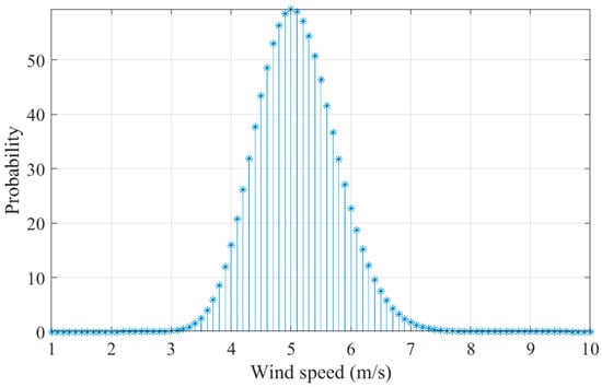 where is the nominal WT power, is the nominal wind speed, is the cut-in wind speed, and is the cut-off wind speed. The modeling of the wind speed follows the Weibull PDF , which is calculated, as shown in Equation (16):