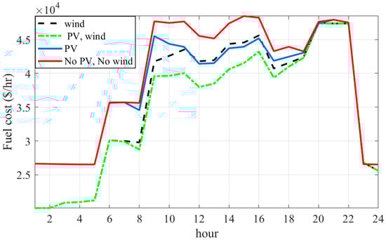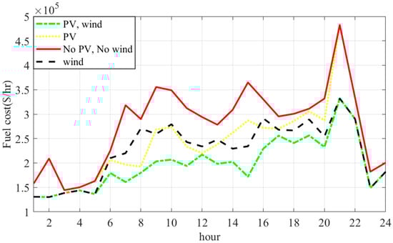 After the simulation is complete and the POPF results are obtained in the four mentioned cases, using the proposed CSA optimization algorithm, the comparisons of the fuel costs of the conventional generators in the four cases can be graphically illustrated, as shown in Figure 10 for the 57-bus test network. The effect of the power generated from the PV systems is observed between hours 6 and 19. This is when solar irradiance is more effective in generating electrical power. The PV cannot be used to generate power beyond this period. On the other hand, the second type of RES connected to the systems, the wind turbine, can generate power at any time, as long as the actual wind speed is within the range of the cut-in and cut-off speeds. The cost reduction due to the integration of the WT can be observed throughout a typical day.
