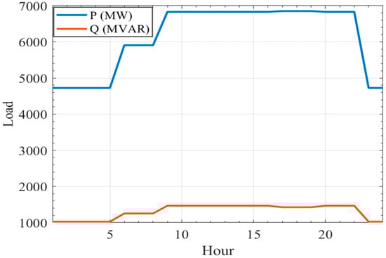 The CSA optimization method is used to perform the POPF. The system used in this subsection is the IEEE 57-bus system, with modifications. The PV and WT generators are inserted into the test system at specified buses. The PV array is connected to bus 37. Meanwhile, the WT farm is connected to bus 12. The loads are assumed to change hourly, as shown in Figure 5 []. The one-line diagram of the standard 57-bus test network can be found in Figure A1, in Appendix A. The location of the PV array is marked with red in the single-line diagram, while the location of the wind turbine is marked in green.