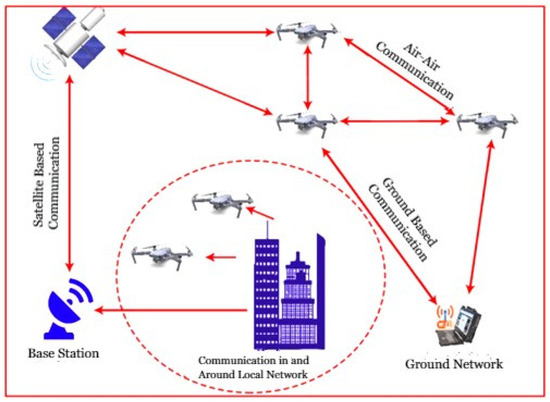 where R in particular is one of the elements that determines UAV deployment. For instance, the R should be high in the event of military use. In order to secure and reliable communication, communication of UAVs as well as data sharing between the UAVs in the network UAV layer. A UAV can only store data in B public when the rules and criteria of SC are fulfilled. On the other hand, UAVs can also use network to detect data from to assure confidentiality as well as secrecy of data. Every single UAV has a common ledger replica, thus reducing the latency of access to stored information. To reduce latency and boost system reliability, communication between UAVs and ground stations through a communication network of 6G. The blockchain-based UAV can be represented by Equations (3)–(6),