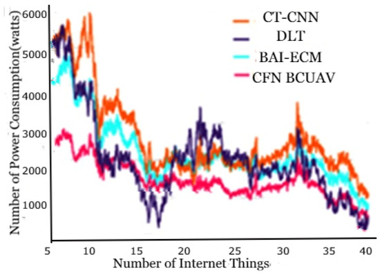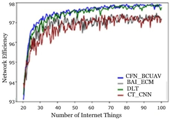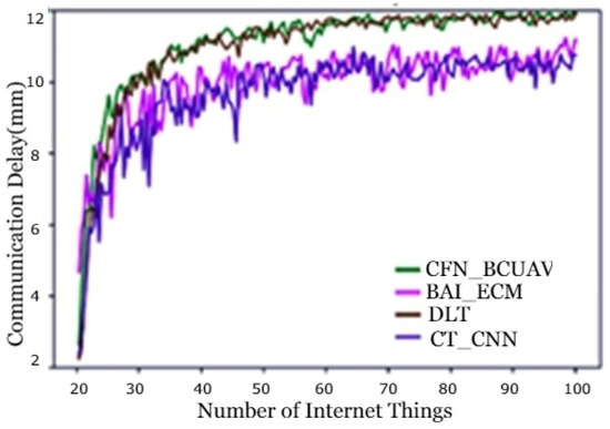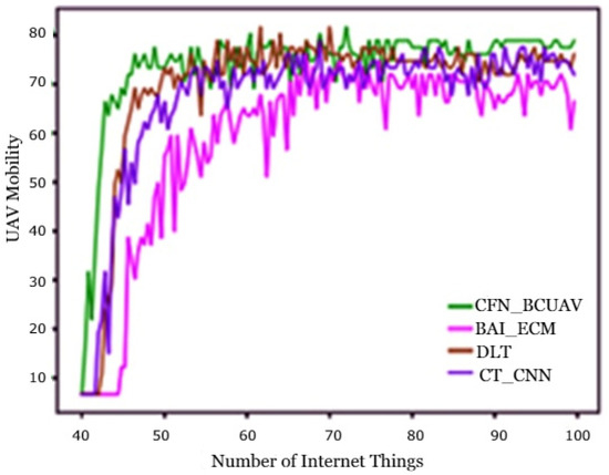 The above Table 1 and Table 2 show a comparison of network efficiency, communication delay, and average power consumption, and Figure 6, Figure 7, Figure 8, Figure 9, Figure 10, Figure 11 and Figure 12 show their graphical representation in comparison between existing and proposed techniques. From Figure 6, Figure 7, Figure 8 and Figure 9 shows the network efficiency as well as the cloud computing layer delay has been initiated due to a delay in communication in cloud servers with edge servers. On one hand, this is on the grounds that the correspondence with a significant distance from end clients to the cloud server center may create high postponement. Then again, the limit of organization data transfer capacity builds the transmission delay from edge devices to cloud workers incredibly. As the measure of information increments consistently, the correspondence defers increments quicker. Figure 10, Figure 11 and Figure 12 show communication latency, UAV mobility, and connectivity of UAVs. The bends turn 100% of responsibility in the cloud. This shows that the transmission rate acts simultaneously with the mist handling rate introduced. The dormancy at the mist will be improved as more work is moved to the cloud.