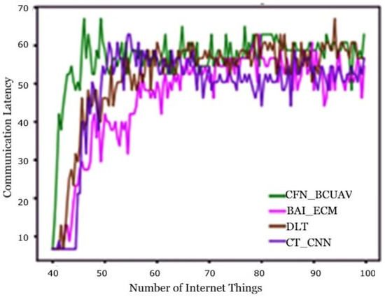 For exchange between UAVs, base stations, level of BC, and the x-layer, the communication system is a 6G system that delivers an enormously large range of information, ideal for latency-conscious applications. The features of the network layer of 6G communication include highly reliable (10−9), highly minimized latency (1 TB), and in elevation spectrum performance (3–10 P/M over 5G). The complete list of 6G functionalities compared to 5G can be found in Table 1. 6G provides software-defined networking (SDN) which isolates the control plane (CP) and the data plane (DP), allowing a centralized entity (controller) in the CP to configure the forwarding devices in the DP, enabling programmable and dynamic network setup, and network function virtualization (NFV) is a paradigm for network architecture where NFs that previously utilized specialized vendor-specific hardware [38]. SDN is a software prototype that splits the level of data from the controller to simplify and efficiently manage the UAV network. NFV virtualizes network infrastructure, including computer, memory as well as machinery components of the channel, in order to create a channel of UAV with more economic, effective and resistant. Since some of the UAV applications are crucial, even a 1 ms interval cannot be tolerated. The military and healthcare applications would be such. More latency of the network, the more chances of failure. Thus, latency (l) in UAV communication is a key parameter as given in Equation (7):