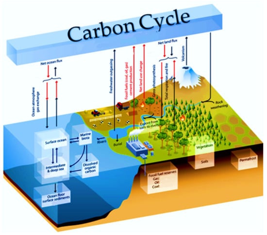 Human population growth and economic development in each country/region are two major contributors to the increase in atmospheric carbon release (as CO2). Two major contributors to carbon dioxide emissions are the energy intensity of the economy and the carbon intensity of the energy system. However, there is a dearth of available CO2 sinks. Carbon emissions from human-caused sources are highlighted in Figure 1, which depicts the global carbon cycle [8,9]. There are not many options for cutting down on CO2 production. There is no political or technologically sound way to address the problem by reducing the population or lowering living standards; therefore, other alternatives are all that remain for cutting down on CO2 emissions. UNFCCC has identified the following options as the most promising ones: