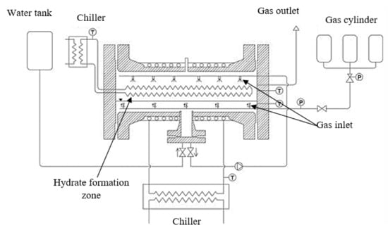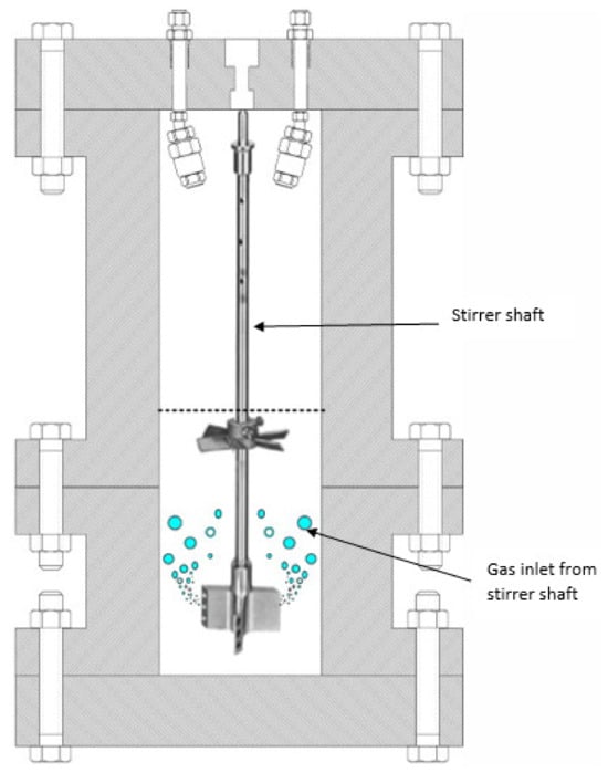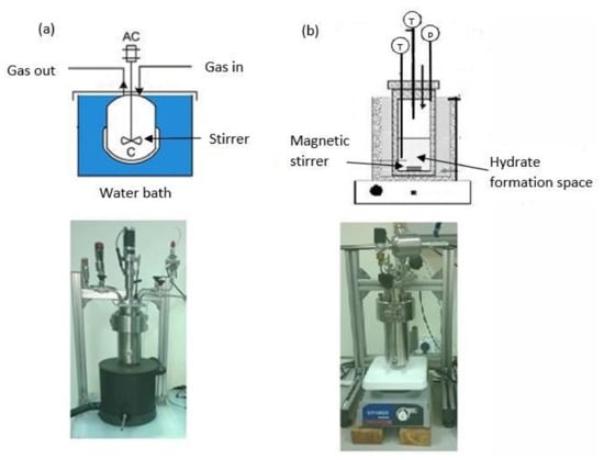 The stirrer-tank reactor (STR) is a common equipment in gas hydrate lab-scale installations [132,133,134,135,136]. Due to its ease of use, this type of reactor is ideal for closed-system, low-throughput batch applications. A liquid phase predominates in these reactors. The stirrer is used to combine the gas and liquid phases.