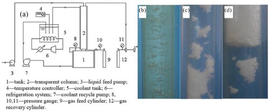 - Li, G.; Liu, D.; Xie, Y.; Xiao, Y. Study on effect factors for CO2 hydrate rapid formation in a water-spraying apparatus. Energy Fuels 2010, 24, 4590–4597. [Google Scholar] [CrossRef]