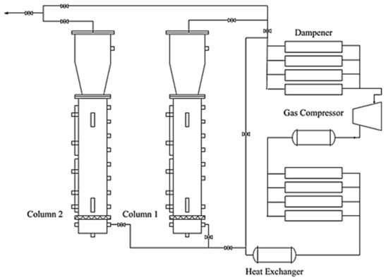 Adsorption is a surface-based process where atoms, ions, or molecules from a gas, liquid, or dissolved solid bonding to a solid surface. From an industrial viewpoint, adsorption is a very important phenomenon that involves different aspects of chemical engineering. Adsorption is involved in various natural gas treatment processes and can be broken down into three different categories: chemisorption, physisorption, and size exclusion. Chemisorption is normally happening in catalytic processes such as Fischer– Tropsch synthesis [42]. Physisorption is reversible adsorption on the surface of a material. Silica gel dehydration is the most famous physisorption adsorption [43]. In size exclusion, the target molecules fit into the pores of the adsorbent, and the rest passes by. CO2, N2, or O2 capturing is an example of this category of processes. In the physisorption and size exclusion categories, the process is almost the same. Pressure swing adsorption (PSA), vacuum swing adsorption (VSA), and temperature swing adsorption (TSA) are processes for the continuous capturing of target gases on industrial scales. PSA is the most practiced and studied process for capturing CO2 from flue gas [44]. As the adsorption takes place in a fixed bed column of absorbent, for the continuous process, at least two parallel columns are required in the PSA process. One column should capture the gas and the second one should regenerate [43].