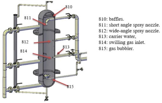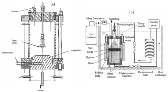 The third common type of gas hydrate reactor is a spray tower. By spraying water into a continuous gas phase region, the gas/water interfacial area can readily be increased. Furthermore, as the tiny water droplets have large velocities in the gas phase of the reactor, the necessity of a mechanical stirring system is eliminated from this type of reactor. Thus, the design of the reactor is simple, and scaling up can be achieved easily; however, as the heating capacity of the gas phase is small, and a large portion of the spray tower is occupied by the gas phase, the heat of the hydrate formation may not be removed throughout the reactor walls efficiently—this will easily increase the reactor temperature. By increasing the temperature, the system super-saturation condition, which is essential for crystallization, would be decreased, and this would result in decreasing the rate of hydrate formation or even stopping it [120].