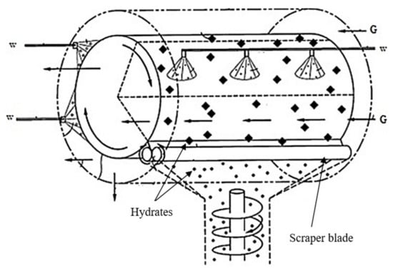 Ever since gas hydrates were first discovered, scientists have developed a wide variety of equipment to study them. Typical gas hydrate crystallizers and reactors were reviewed by Mori et al. [120]. Normally, stirrer-tank, bubble columns, or spray towers are used for gas hydrate crystallizers in both thermodynamics and kinetics studies. In addition, the rocking cells are used for thermodynamic studies [128,129] and the pipeline condition is simulated by means of the flow loops [130,131]. Moreover, there are a few unique crystallizers, the vast majority of which are currently protected by patents. In this section, we provide a review of these reactors and analyze the pros and cons of using them in an industrial setting. This analysis excludes rocking cells and flow loops since these types of reactors are not applicable to gas hydrates production on an industrial scale.