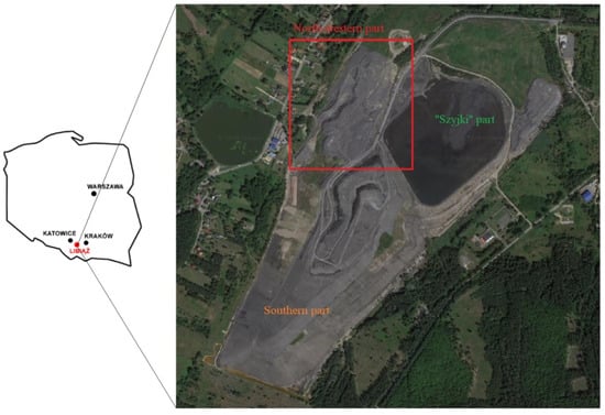 In terms of geography, the Janina mine waste dump is located in the area of Krakowska st. in the southern part of Libiąż town, Chrzanowski county, Lesser Poland Voivodeship, approximately 350 km south-west of the capital, Warsaw. The mine waste dump area is divided into three parts, i.e., the active southern part, the Szyjki tailings part, and the north-western part. The studied site is located between the west of Dąbrowskiego st. and the east of the Szyjki tailings (Figure 3). The dump has a surface area of 33.51 ha and a storage capacity of approximately 8 million m3 (~13 million Mg). Waste material from the mechanical coal processing plant contains 33% coarse grains and 67% fine grains and, separately, contained sand (28.5%), silt (22.5%), and clay (16%). The general slopes of the Janina mine waste dump have a slight inclination, not exceeding 30°. Intensive rainwater runoff along the fall line was observed due to the lack of an proper drainage system [37,38].