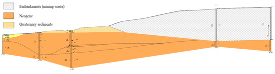 The geological structure of the studied site is built of Triassic formations (subsoil) and Neogene and Quaternary formations in the overburden. The Neogene consists of clays with interfacing or laminations of sands, marls or dusts. These formations constitute an impermeable complex for the Quaternary aquifer. Their thickness is approximately 90.0 m. The Quaternary consists of sands and clays. The thickness of the Quaternary formations ranges from approximately 3.0 m to a dozen meters. Above, there are Quaternary anthropogenic sediments in the form of non-construction embankments with a varied lithological composition. They are formed by soils made of medium-grained sands mixed with sandy loams and post-mining materials [38].