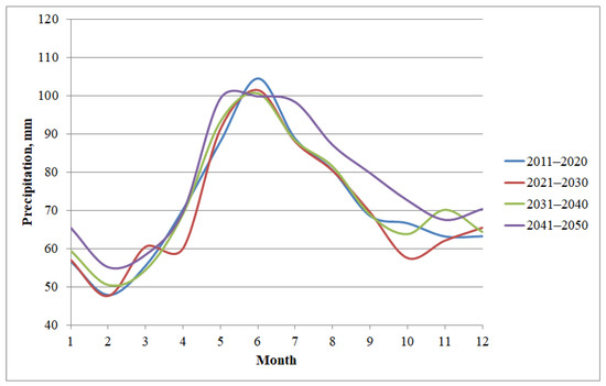 In Chrzanowski county, the average annual amount of precipitation is predicted to reach 900 mm to 2050. Maximum precipitation occurs in three months: May, June and July with the monthly value of approximately 100 mm (Figure 5).