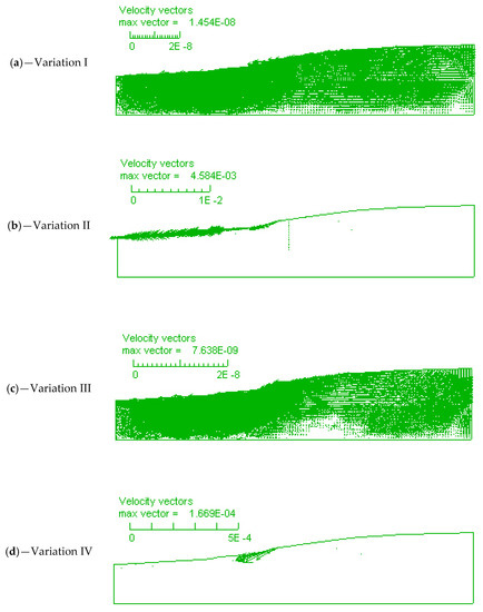 Values of velocity vectors for Variation I and Variation III are much less than the permissible value (10−5), while values of velocity vectors for Variation II and Variation IV are greater than the permissible value (10−5) (Figure 7). With the initial saturation of 0.84 (Variation IV), the potential landslide is observed on the toe of mine waste layer (Figure 7d), while in variation II, with the initial saturation of 0.89, the potential landslide occurred along the lower part of entire slope (Figure 7b). Maps of velocity vectors indicate that the slope is still stable at the end of the rainfall events in Variation I and Variation III and instable in case of high rainfall intensity, such as variation II and IV. Moreover, higher rainfall intensity can cause a larger landslide.