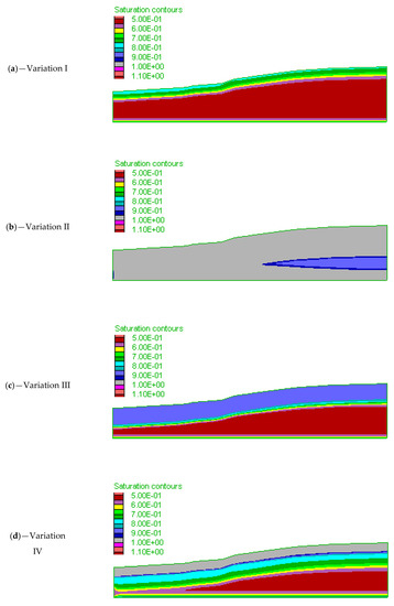 Maps of saturation indicate that the slope is still stable after the rainfall scenarios in Variation I and Variation III. Value of saturation at the slope surface was less than 0.9 in case of Variation I and Variation III (Figure 8a,c). The slope surface in case of Variation II and Variation III is considered full saturated (close to 1) (Figure 8b,d). The size of saturation inside the slope body was increased with the increase of initial saturation. The increase of saturation is responsible for the subsequent reduction in shear strength (cohesion) of soil and ultimately, failure of slope occurred in case of Variation II and IV.