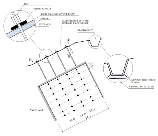 The above slope stability analysis has pointed out the potential failure on the slope surface in case of a rainfall event of high intensity and short duration. Therefore, slope reinforcement is required to avoid slope failure in a case of such a rainfall. After determining the location of the potential landslide, slope reinforcement using nailing and steel mesh was proposed for the Janina mine waste dumps against the impact of high rainfall intensity. Once again the same slope stability analysis was conducted with slope reinforcement for an example of Variation IV. Figure 9 presents a scheme of the slope reinforcement, which consists of soil nailing with 6 m long, steel mesh and an anti-erosion geogrid along slope surface with humus soil and grass seeding. Additionally, water drainage will be included in the form of a ditch made of ameliorative concrete channels.