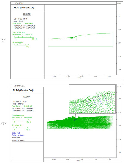 Maps of velocity vectors in Variation IV as an example: (a) without any slope protection, (b) with slope reinforcement using nailing and steel mesh.