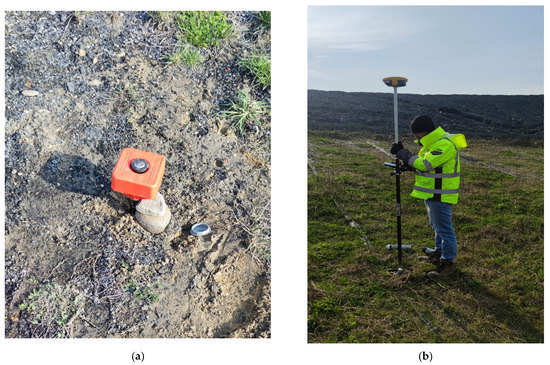 In order to fit the point cloud into the Polish Coordinate System 2000, 11 photo points were established in the studied site (Figure 11a), then measured in 20 epochs with the GEOMAX Zenith 40 receiver (Figure 11b). After the photo points were installed, an autonomous photogrammetric flight with the Phantom 4 RTK Quadrocopter (Figure 11c) was performed from a ceiling of 40 m.