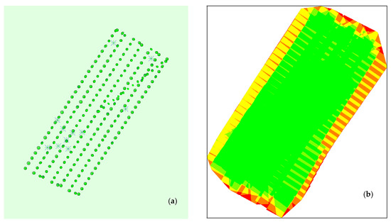 As a result of the photo processing from the photogrammetric flights (19 April–11 August 2022), the following results were obtained: number of photos: 217 ÷ 220, median of the characteristic points found in the photos: 75,115 ÷ 78,484, difference between the initial and calculated camera parameters: 2.85 ÷ 2.89%, median of the common points found per photo: 43,418.9 ÷ 49,612.2, average cloud fit error: 6.8 ÷ 7 mm (Figure 12).
