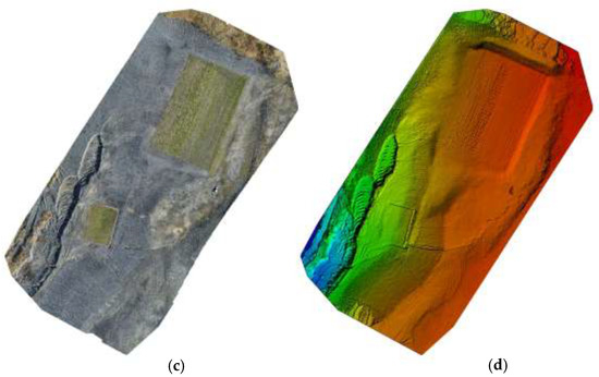An example of photo processing: (a) Initial Image Positions, (b) Overlap between images (c) Orthophoto map, (d) Numerical model of studied area coverage (19 April 2022).