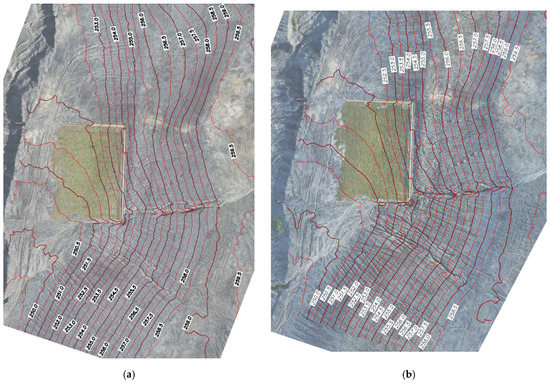Orthophoto maps with contour lines of the studied site: (a) 19 April 2022; (b) 11 August 2022.
