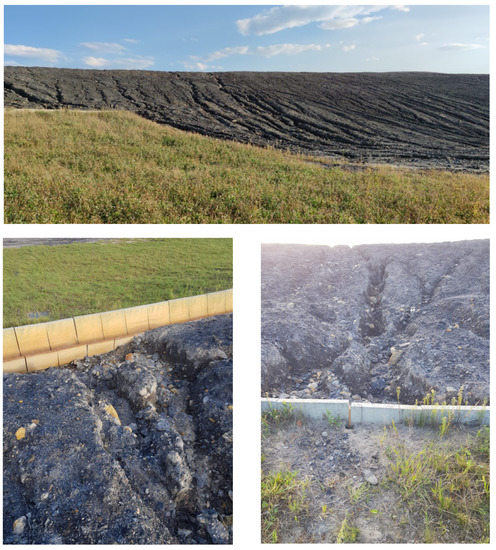 In Poland, coal mine waste dumps mostly contain multi-grain sizes of claystones, mudstones, sandstones, conglomerates, carbonates, carbonaceous shales, and pyrite-bearing carbonaceous rocks [24,25,26]. The Janina coal mine commenced construction operations related to depositing its mining waste on the slopes in mid-2006. In the period August–November 2016, movement of the mine waste dump slope was observed in the north-western part, i.e., an approximately 300 m section of ditches has been moved away relative to the designed boundaries to the built-up areas at Dąbrowski street (Figure 1). As an element of landslide prevention, depositing operation has been stopped. In general, the geodetic measurements showed that the slope movement process has been completely slowed down. However, the increase in displacements of slope has been observed at some measuring points, where the rainfall and snowmelt water migration in the subsurface layers occurred. The effects on the slope surface started to be visible in 2017 (Figure 2).