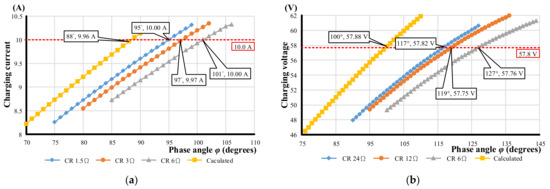 The calculated results from Equations (9) and (14) were carried out, and the experimental setup operated under open-loop control and constant resistance (CR) mode. The phase-shifted angle was tuned to reach the regulated current in CC mode or the voltage in CV mode to verify the function. To verify the prototype under open-loop condition, the resistance was chosen at 1.5 Ω, 3 Ω, and 6 Ω under CC mode, and the resistance was chosen at 6 Ω, 12 Ω, and 24 Ω under CV mode. In Figure 4a, it can be seen that to maintain a constant charging current while the charging power is increased, the phase-shifted angle should also be increased. In Figure 4b, the phase-shifted angle will be reduced to maintain a constant output voltage, thus avoiding the battery voltage increasing continuously under CV mode. From the open-loop experimental results shown in Figure 4, it can be seen that to remain a constant charging current and voltage, there will be an angle variation of about 4° in CC mode and 10° in CV mode. Therefore, in a practical implementation of a hybrid compensated IPT charger, MCUs are required to achieve the closed-loop control by adjusting the phase-shifted angle to regulate the charging voltage and current.