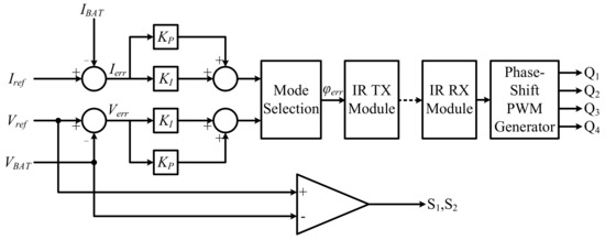 To fulfill the charging requirement in the charging process, the closed-loop control scheme is shown in Figure 5. The sensed charging voltage and current were compared with the reference value to determine the error signals, Ierr and Verr. The error signals were fed to the proportional-integral (PI) controllers to determine the corresponding phase error φerr. These data were then transmitted to the primary side and a new phase-shifted angle was adjusted by MCU #1 via the received angle from the secondary side. Accordingly, the phase-shifted PWM signals of the inverter were also generated. The control signals of the bidirectional switches S1,2 were also determined by MCU #2 according to the comparison between the reference voltage and charging voltage.