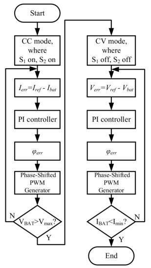 The control flowchart with CC-CV mode selection and phase-shifted angle is shown in Figure 6. While in CC mode, the two switches S1,2 were turned on and the phase error φerr was determined by the current error and PI controller. Once the battery pack voltage was increased to the maximum charging voltage Vmax, the charger switched into CV mode and the two switches S1,2 were turned off. Then, the phase error φerr was determined by the voltage error and PI controller. Finally, while the charging current in the CV mode was lower than the preset minimum charging current Imin, the whole charging procedure was then finished.