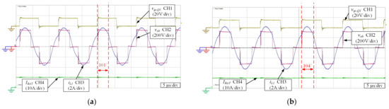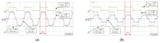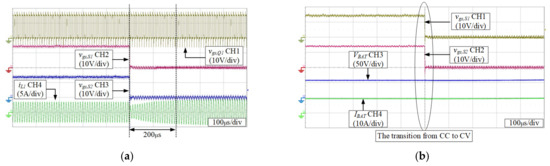 The waveform of the IPT configuration operated under CC mode is shown in Figure 9, and the electronic load was operated in constant power mode as a circuit load to simplify the experiment operation. In Figure 9a, the output power was about 480 W. To verify the performance of IR feedback under CC mode, Figure 9b shows the waveform when the electronic load was operated at a constant power of 600 W. The current remained at 10 A in CC mode, and the phase-shifted angle was adjusted from 101° to 104°. Figure 10 shows the transient waveforms of the IPT charger when the CC mode was switched to the CV mode. The gate drive signals vgs,s1 and vgs,s2 on the secondary side were switched at the same time to change charging mode from CC to CV mode. Due to the change in the configuration via switching S1 and S2, the phase-shifted angle should be pre-adjusted to accelerate the transition into a steady state. In Figure 10a, the current iL1 can be achieved to a steady state in only about 200 μs during the transition period. Figure 10b shows that both VBAT and IBAT can achieve a smooth transition. In Figure 11, the IPT circuit was operated under CV mode, and the charging current was gradually decreased due to the remaining CV output. During the initiation of the CV operation, the peak value of the current iL1 was 3.8 A while the phase-shifted angle was about 128°. As the battery was gradually charged, the phase-shifted angle was reduced to 120°, which was calculated from MCU #2 according to the charging voltage and current. The peak value of the current iL1 was also reduced to 1.8 A at the same time. The voltage of the battery was maintained at 57.8 V, which shows that the voltage regulation function in CV mode.